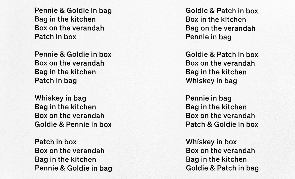 Mitch speaks with playful precision in an idiolectic blend of archaism and vernacular, finding humour in observation. His spoken language is akin to his visual language, which combines refined mastery with a distinctly contemporary inflection. He loves literature and language and treats written words and letters like objects to be played with. When his son was learning to speak, games of language surfaced in the paintings. A large painting, Sur Names (2018), an approximate and unresolved anagram of family names, reads like the scrambled ingredients for genetic identity. In his formal investment in language as a visual cue, concrete poetry has been an influential force, specifically the work of Scottish artist and poet Ian Hamilton Finlay, who expanded the possibilities of concrete poetry beyond the page, treating language as material to be constructed, spatialised and encountered as object.